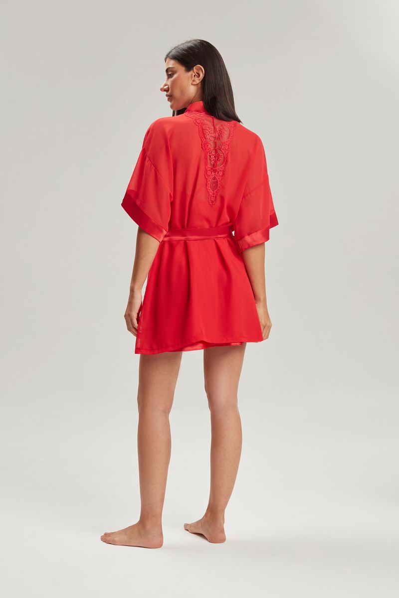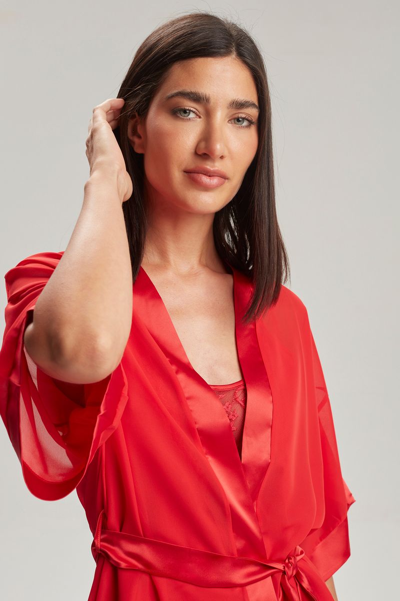 Bata de gasa con sócalo de raso en mangas y vista, y detalle de puntilla en la espalda,esta prenda es ideal para acompañar conjuntos cortos y largos.