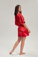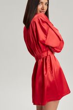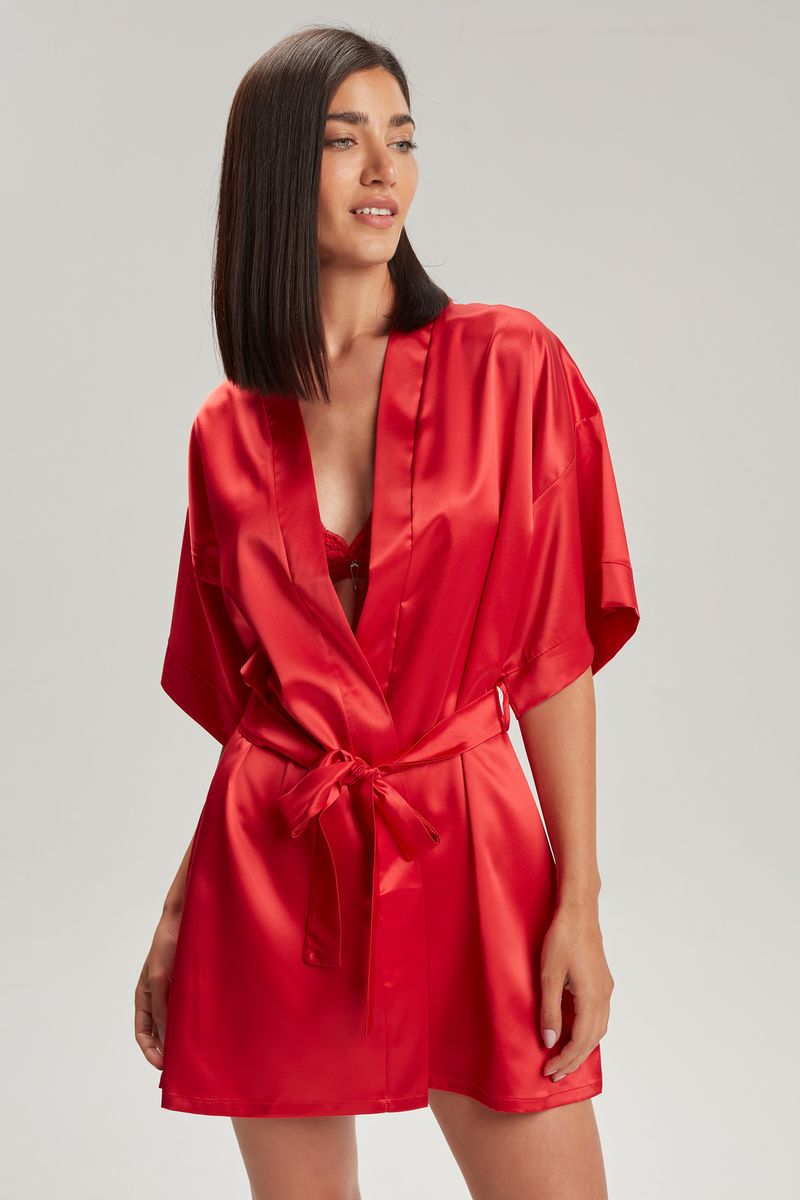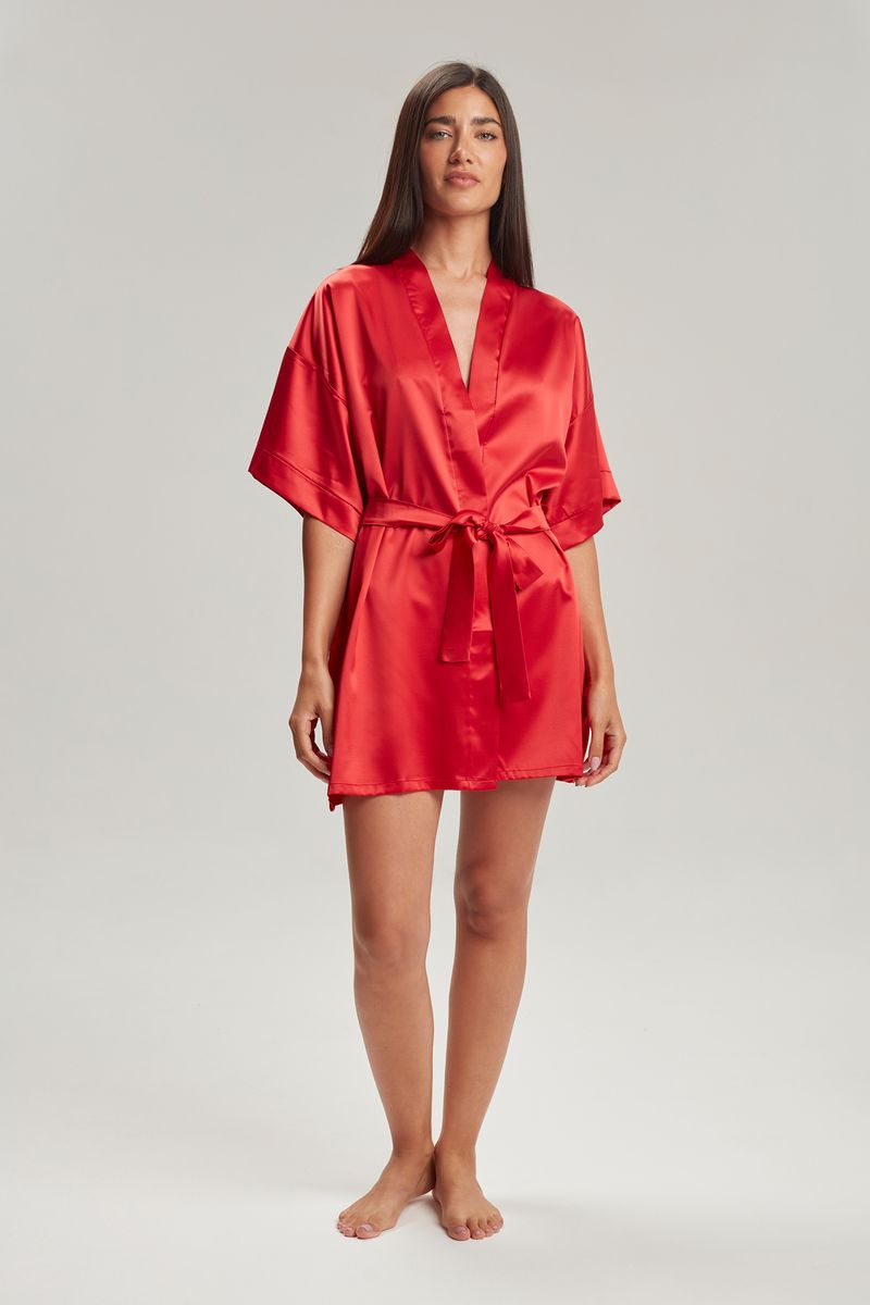 Bata corta de raso liso de corte holgado con lazo para atar, esta prenda es ideal para acompañar conjuntos largos y cortos.