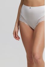 Bombacha de cintura alta, confeccionada en tricot, con delicados recortes de puntilla en los laterales que le agregan un toque de elegancia.