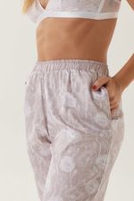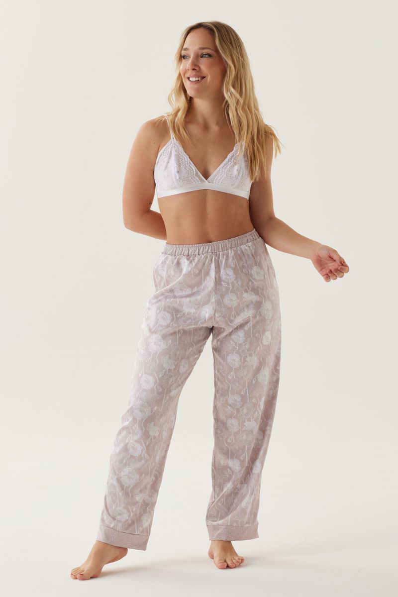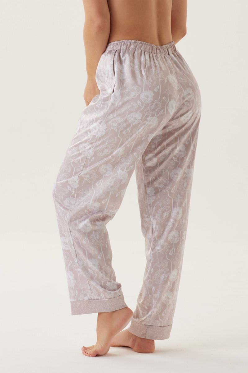 Descubrí nuestro pantalón Agnes confeccionado en raso estampado con motivo floral, con puño en botamanga de raso estampado con motivo de puntos.