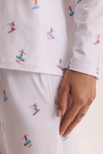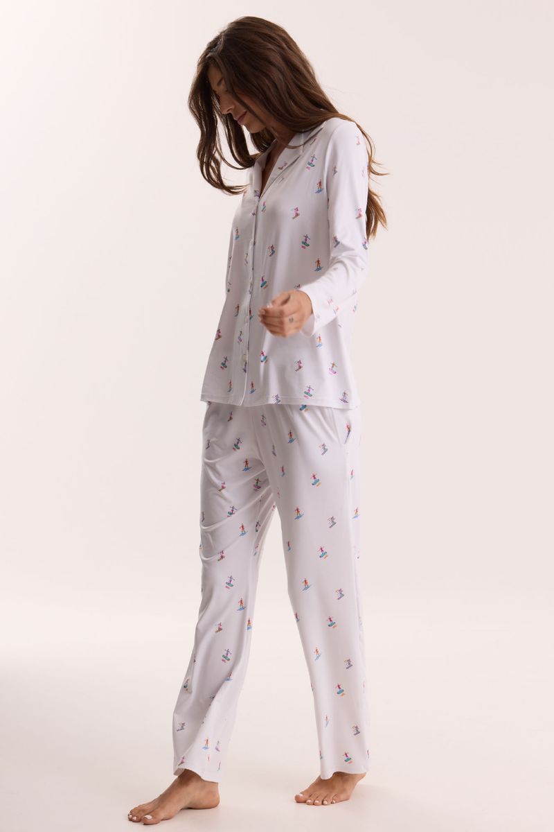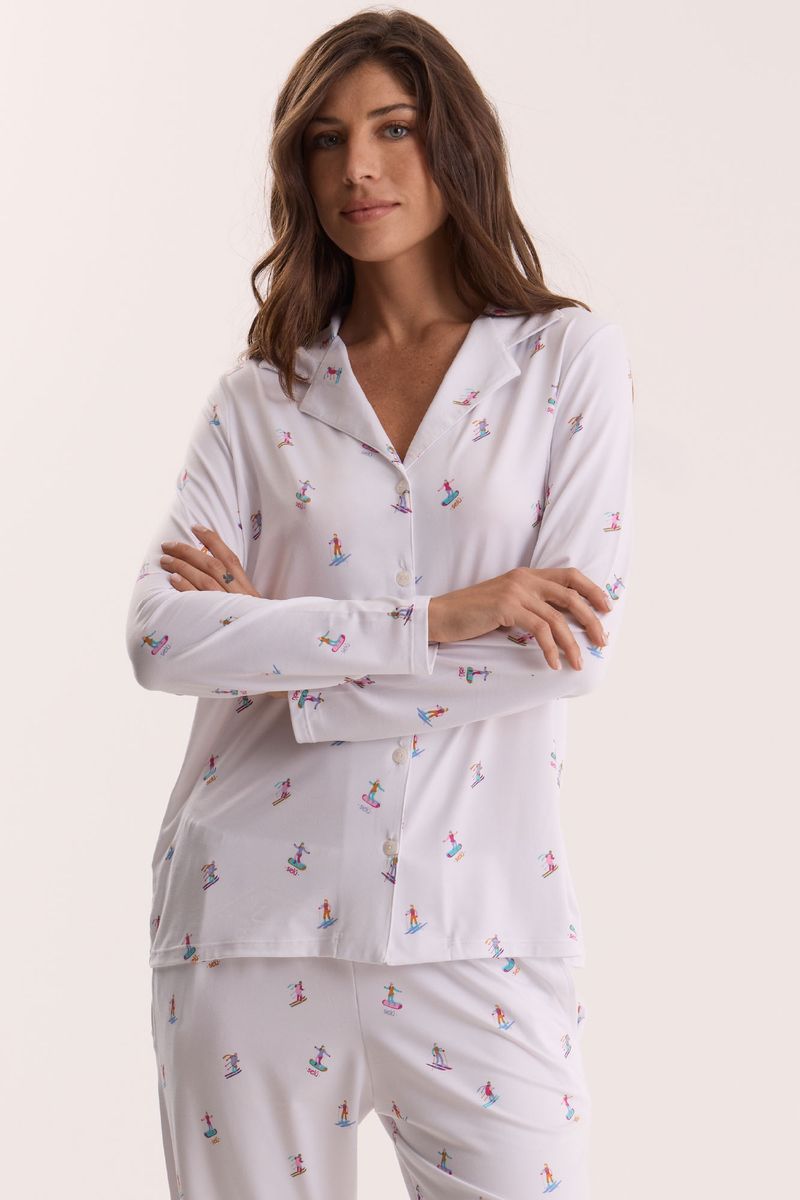 El diseño presenta una camisa de manga larga con cuello solapa y un pantalón haciendo juego, ambos intervenidos por una original estampa de esquiadores sobre un fondo blanco impecable.