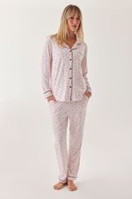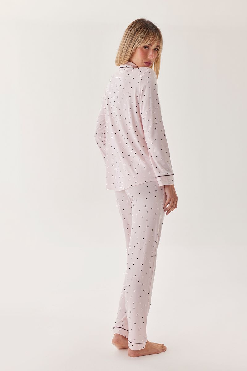 Pijama camisero confeccionado en modal estampado que incluye camisa manga larga y pantalón largo.