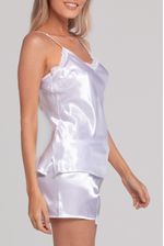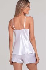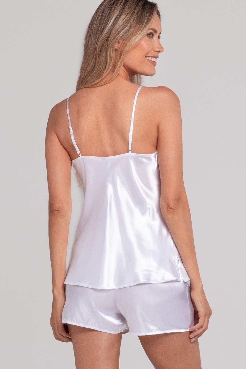 Pijama confeccionado en raso liso: Short de corte holgado con cintura elástica + musculosa con breteles regulables. Posee terminaciones en una delicada puntilla al tono.