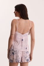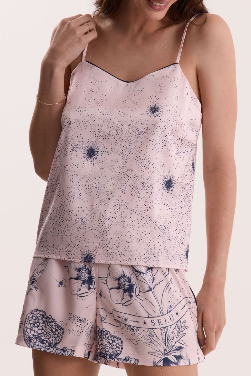 Ideal para los días más cálidos, el pijama corto Eterna se destaca por su frescura y ligereza. La remera con breteles finos, junto al short de cintura elastizada, ofrece una silueta cómoda y fluida, acompañando el movimiento natural del raso. La estampa exclusiva y localizada fue diseñada especialmente para esta tipología, logrando una composición armónica que realza el diseño y aporta un carácter único a cada pieza.