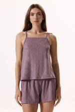 Pijama confeccionado en viscosa desagujada compuesto por musculosa y short. Esta tela se caracteriza por su trama calada formando motivo de caracoles.