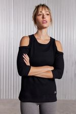 Una opción canchera y versátil para tu día a día. Confeccionada en tejido waffle, esta remera de manga larga se destaca por su textura suave y el detalle de aberturas en los hombros, que le suman un toque moderno y femenino.