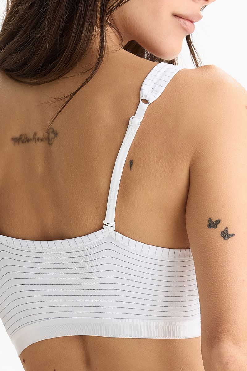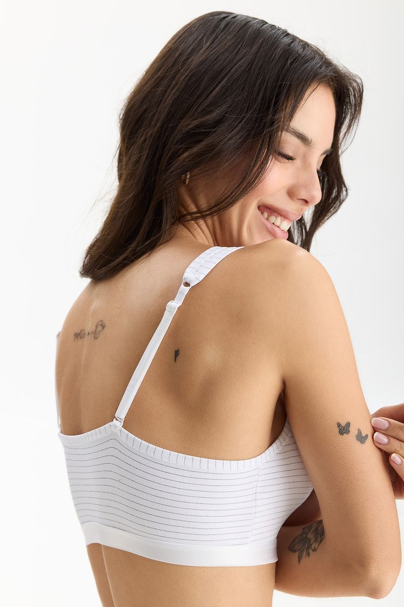 Un top versátil y con un toque de brillo que realza cualquier look. La elasticidad del lurex asegura un calce cómodo, mientras que los breteles ajustables permiten adaptarlo perfectamente al cuerpo.