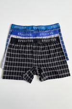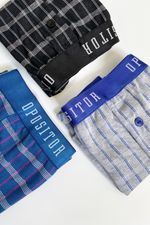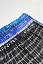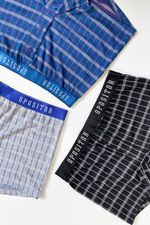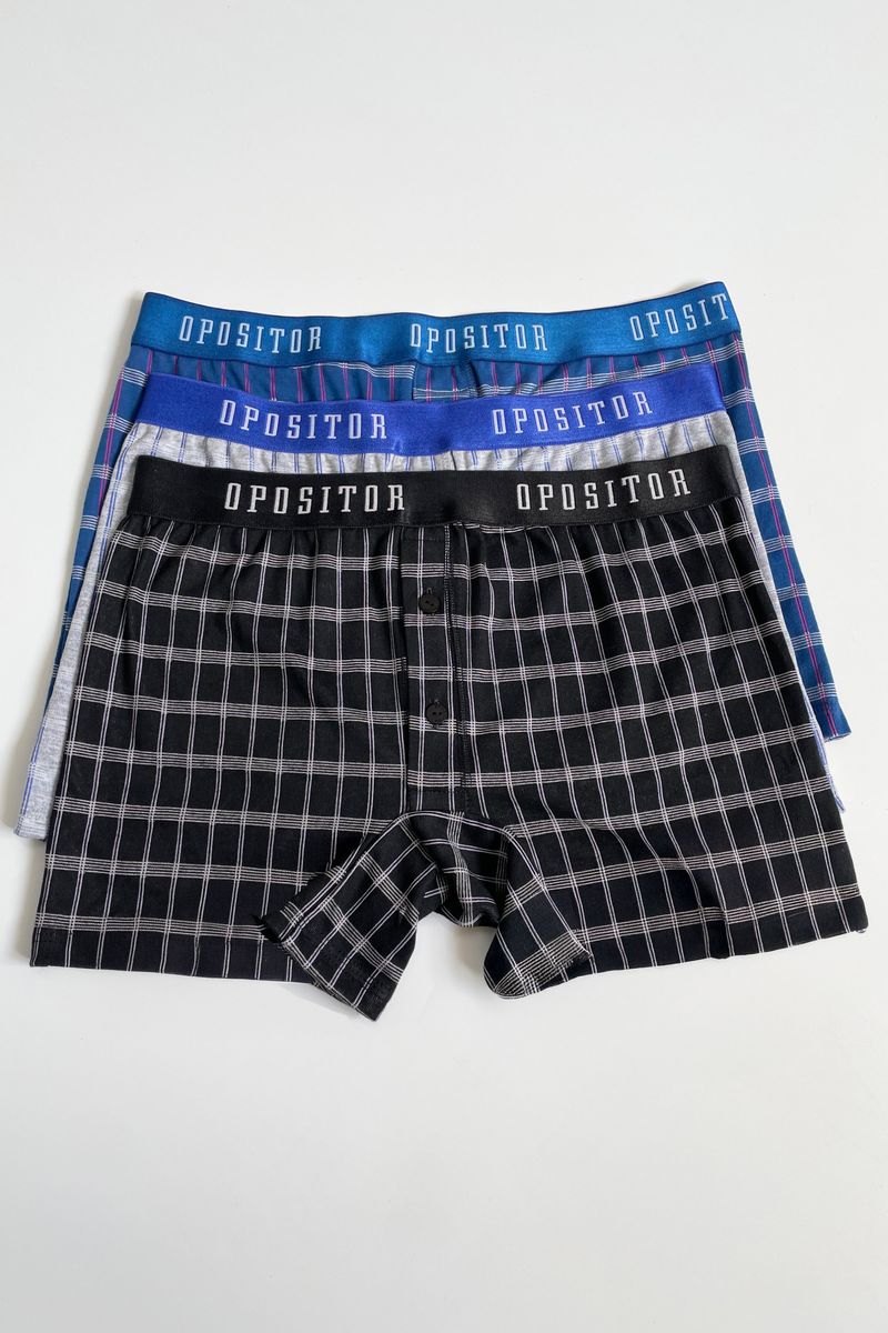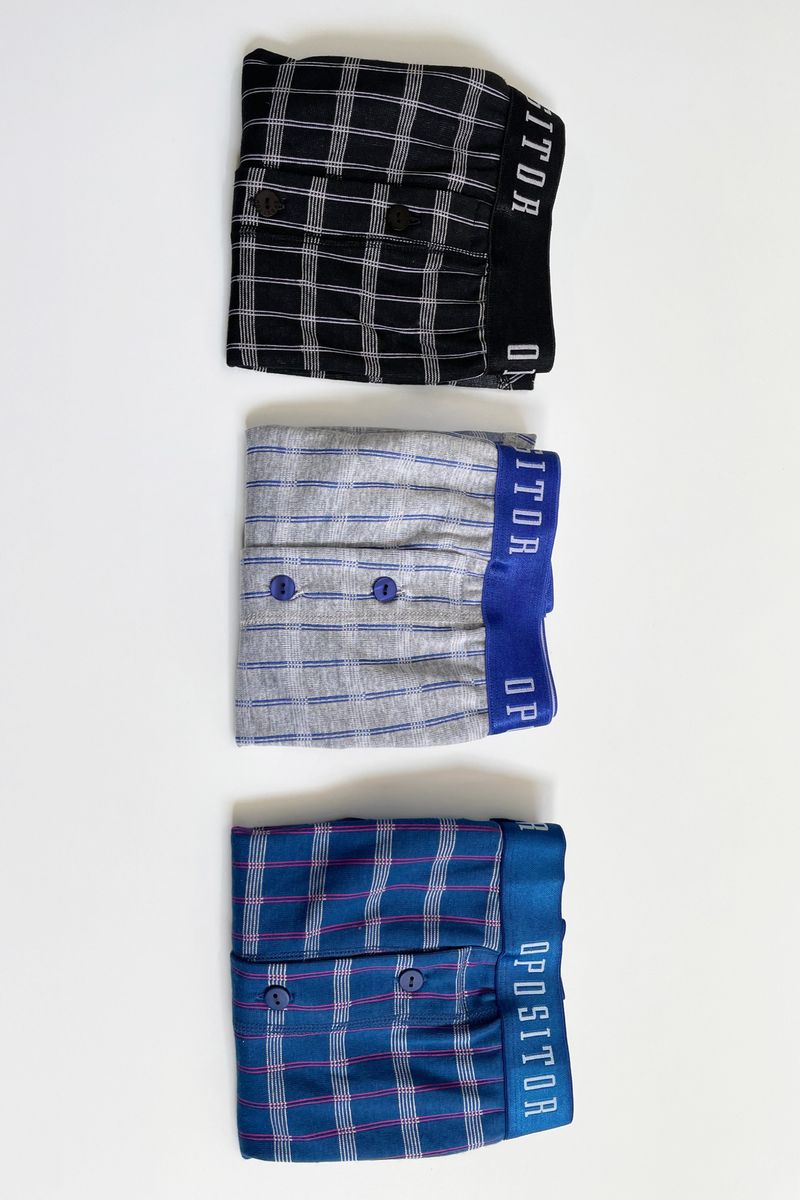 Este tripack confeccionado en algodón garantiza comodidad durante todo el día. Está compuesto por tres variantes de color, gris, negro y azul, con un tejido cuadrillé clásico, y cada prenda cuenta con un elástico a tono que combina perfectamente con el diseño, ofreciendo un calce cómodo y seguro.